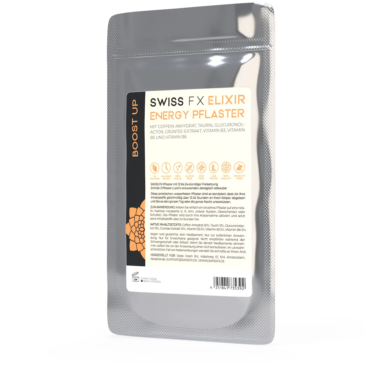 Mit Coffein-Anhydrat, Taurin, Glucuronolacton, Grüntee-Extrakt, Vit. B3/B5/B6. Gleichmäßige Abgabe über 12-24 h; wasserfest, biologisch abbaubar.