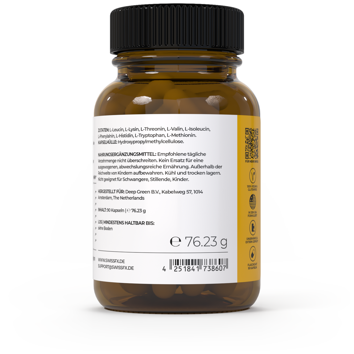 Komplettes Profil aller 9 EAAs inkl. BCAAs; vegan, ohne Zusatzstoffe, laborgeprüft.