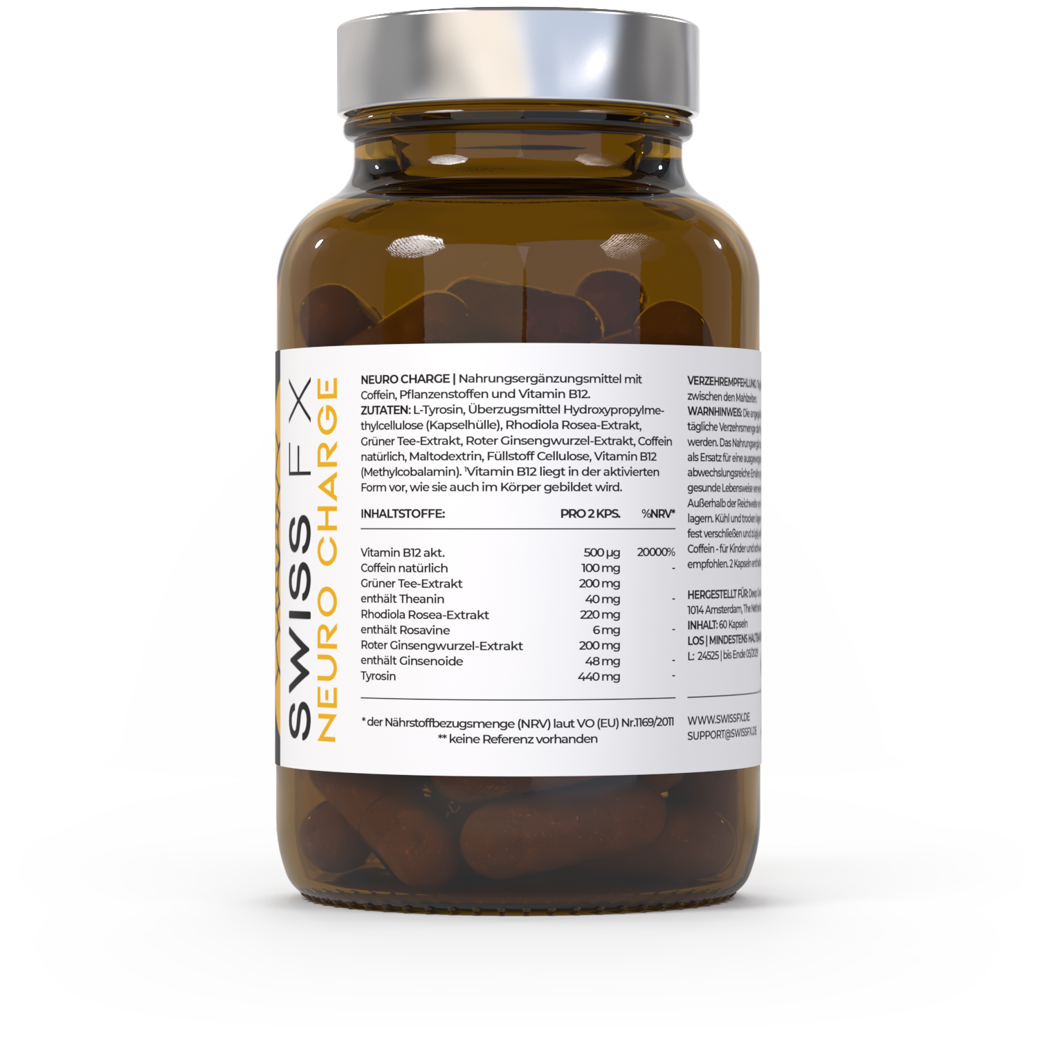 Wirkprinzip: L-Theanin glättet Koffeinspitzen, verlängert Fokus; Tyrosin unterstützt Neurotransmitter unter Stress; Adaptogene (Rhodiola, Ginseng) fördern Resilienz & kognitive Ausdauer; B12 unterstützt Nerven & Energiestoffwechsel.