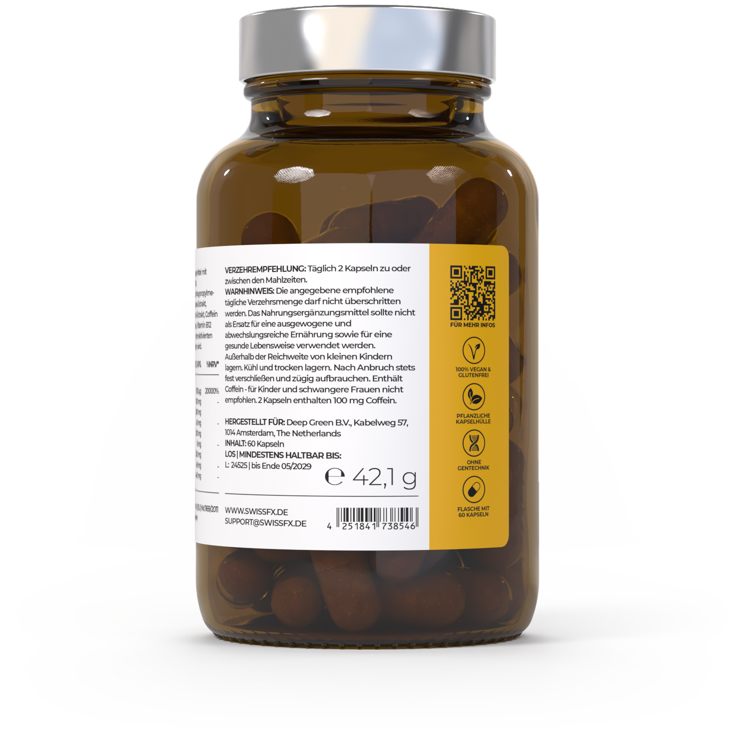 Reinheit: 100 % vegan, glutenfrei, ohne Gentechnik & Zusatzstoffe; in Deutschland nach Reinsubstanzenprinzip produziert; transparent dosiert, laborgeprüft.