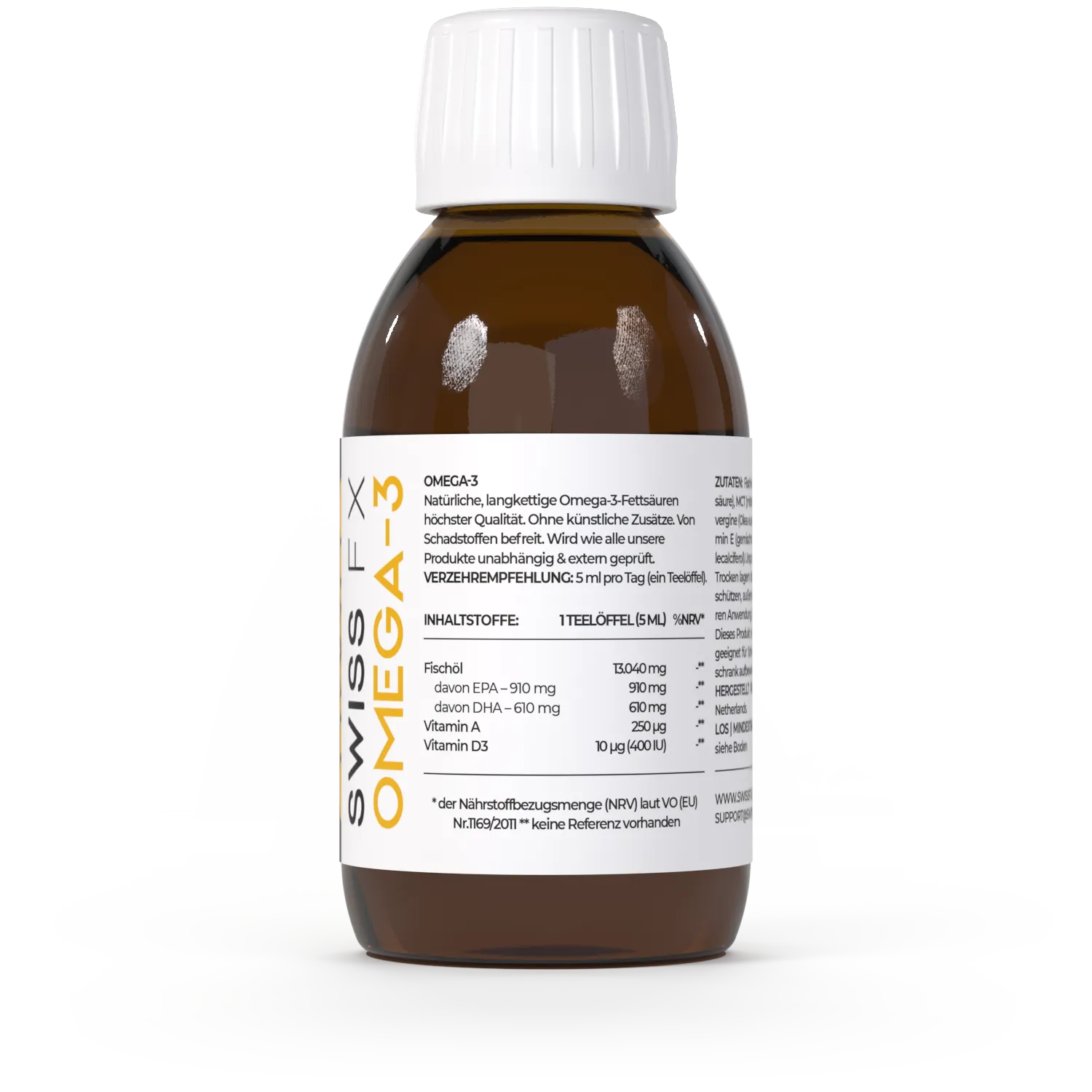 Pro TL (≈5 ml): 1130 mg Omega-3 gesamt – 510 mg DHA, 370 mg EPA, 50 mg DPA.